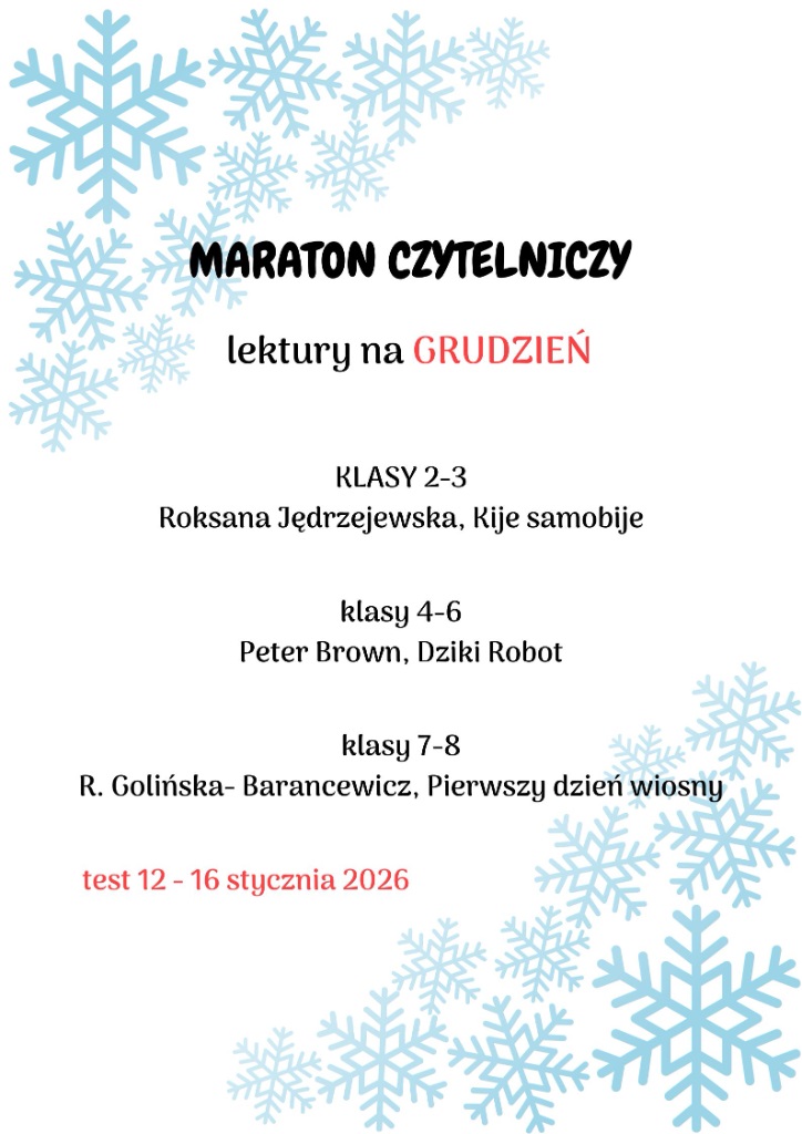 Powiększ grafikę: Wypisana lista lektur na grudzień w otoczeniu płatków śniegu w lewym górnym i prawym dolnym rogu.